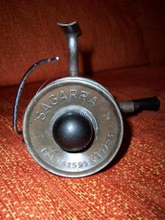 Cuando comenzaron los trabajos de limpieza, entre toda la "cacharrada" que quitaron de la casa -y que iban a tirar- aparecieron varias cañas de pescar. Una de ellas tenía un carrete Sagarra. Yo no conocía esta marca de carretes, pero cuando lo vi (a mi que me encantan las antigüedades!) supe que era algo especial, así que me dije: ésto no va a la basura. Me lo quedo yo.