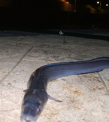 No fue la noche pródiga en grandes piezas que pusieran a prueba mi 46-2 pero resultó entretenida la captura de varios ejemplares kileros que eran arrastrados como si de sardinillas se tratase.Aún no existe en el mercado mejor pertrecho para el pescador de grandes piezas que un Sagarra acompañado de la correspondiente caña de fibra de vidrio maciza.